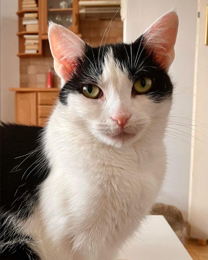 Baronessa to smukła, czarno biała kotka u której wszyscy zachwycają się jej białymi uszami 😁 Z pozoru jest jak Wednesday Adams (nawet kolory pasują), ceniąca swoją niezależność i podążanie własnymi ścieżkami ale w rzeczywistości ma jedno skryte marzenie - stały dom i ludzie na własność, którzy otoczą ją opieką.