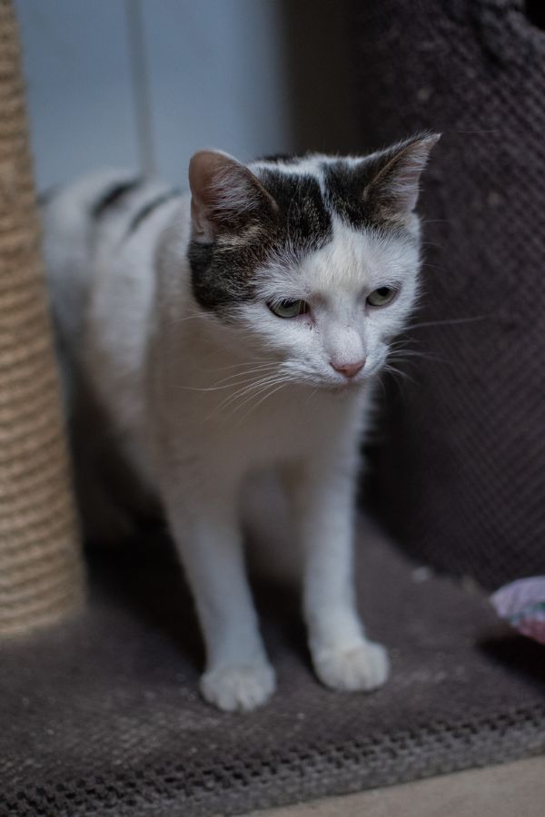 Nie przepycha się do człowieka tak, jak inne, bardziej przebojowe, koty. Nie kłębi się w podgrupie tych, które siedzą przy drzwiach i czekają, żeby tylko miziać się do każdego, kto przyjdzie. Śnieżka zwykle jest z tyłu, ustępuje miejsca innym. Spokojnie czeka, czy ktoś na nią zwróci uwagę, ale nie umie sama o to zawalczyć.