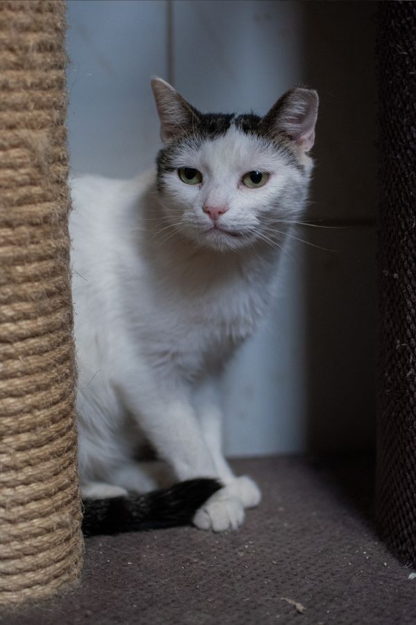 Nie przepycha się do człowieka tak, jak inne, bardziej przebojowe, koty. Nie kłębi się w podgrupie tych, które siedzą przy drzwiach i czekają, żeby tylko miziać się do każdego, kto przyjdzie. Śnieżka zwykle jest z tyłu, ustępuje miejsca innym. Spokojnie czeka, czy ktoś na nią zwróci uwagę, ale nie umie sama o to zawalczyć.